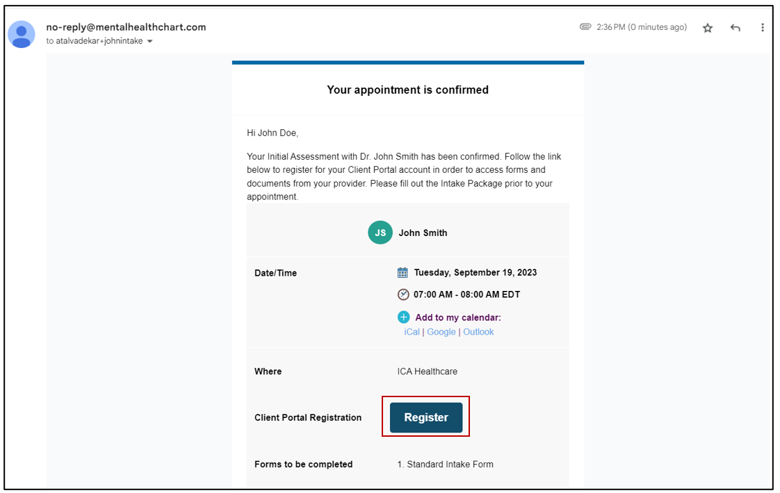 18. The client will receive an email for appointment confirmation as shown below. The client will be notified to complete the standard intake form during registration process.