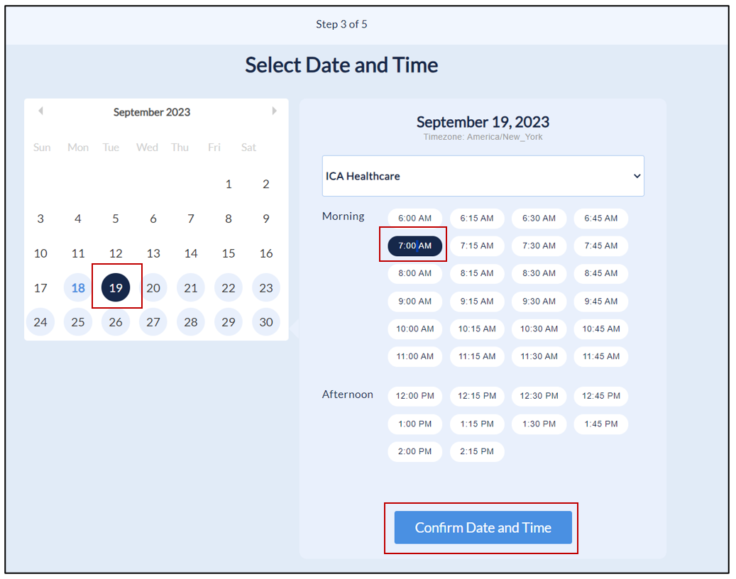 8. The client will then select the desired time slot to book an appointment and click the Confirm Date and Time button.