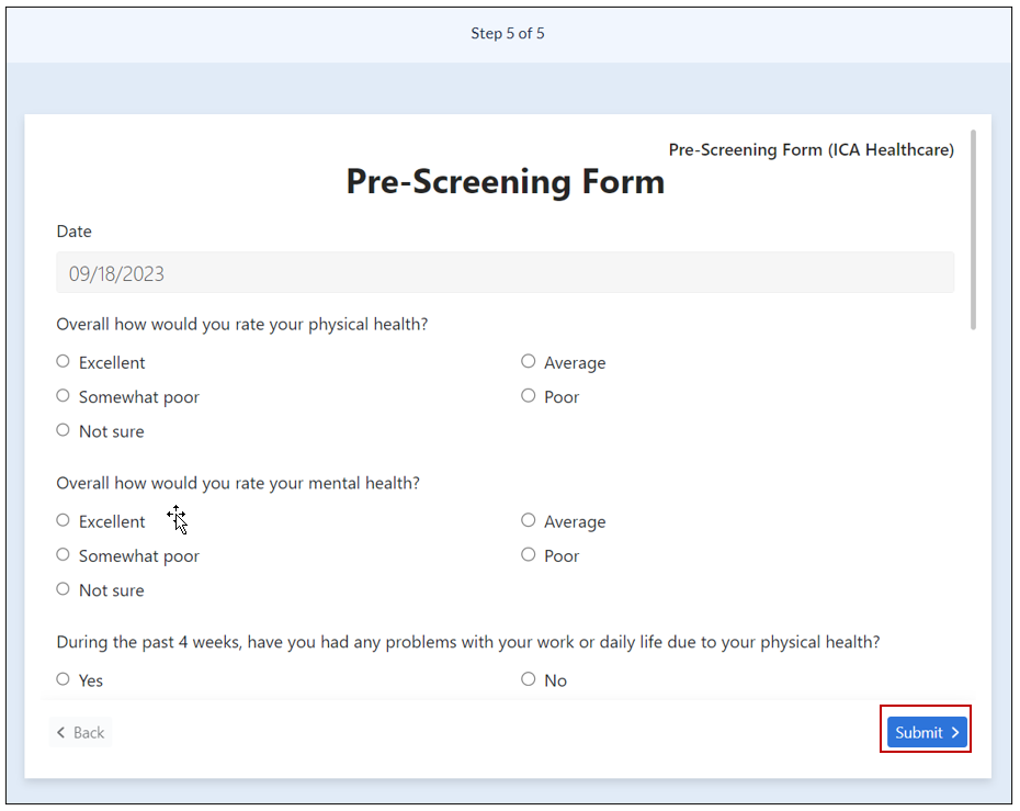 10. When the clients proceed to confirm an appointment, they can see the Pre-Screening Form that you have configured for them as shown in the screen below. They will fill out all the screening details and then click Submit.