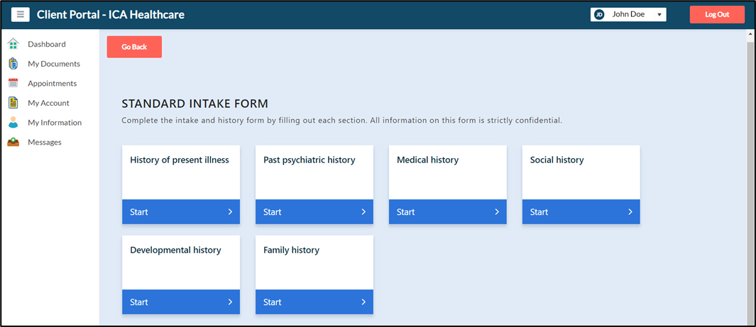 23. The Standard Intake Form that you have configured for the client will appear as shown in the screen below. The client can start the process of filling out the details.