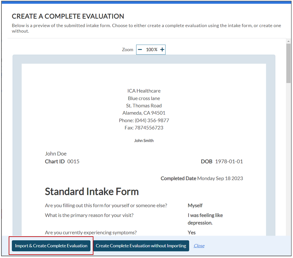 a. Import & Create Complete Evaluation: Click this button to complete the evaluation by importing the standard intake form details the client has filled out.