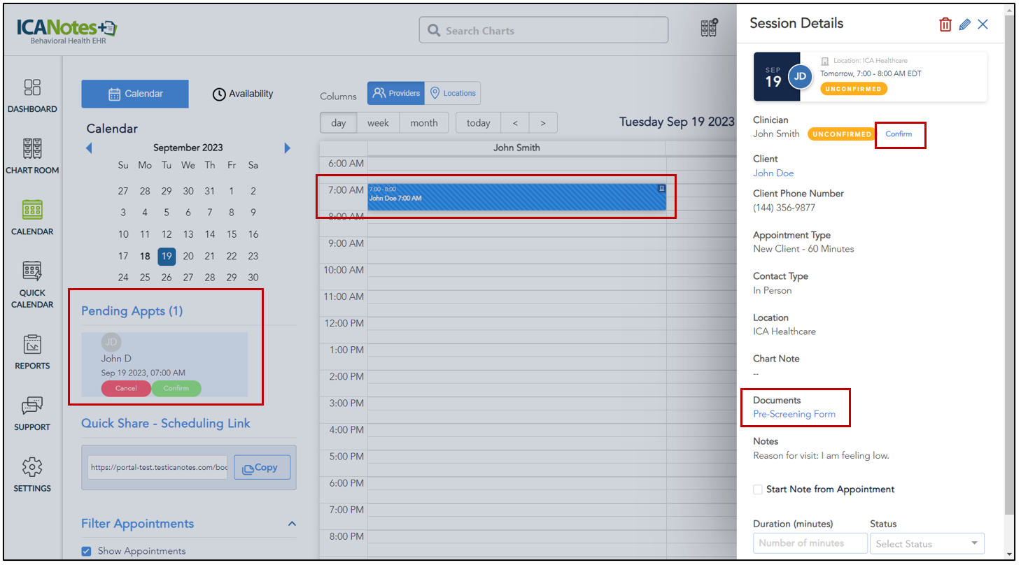 a. In the left pane, the Pending Appointments section will allow you to confirm or cancel the appointment.