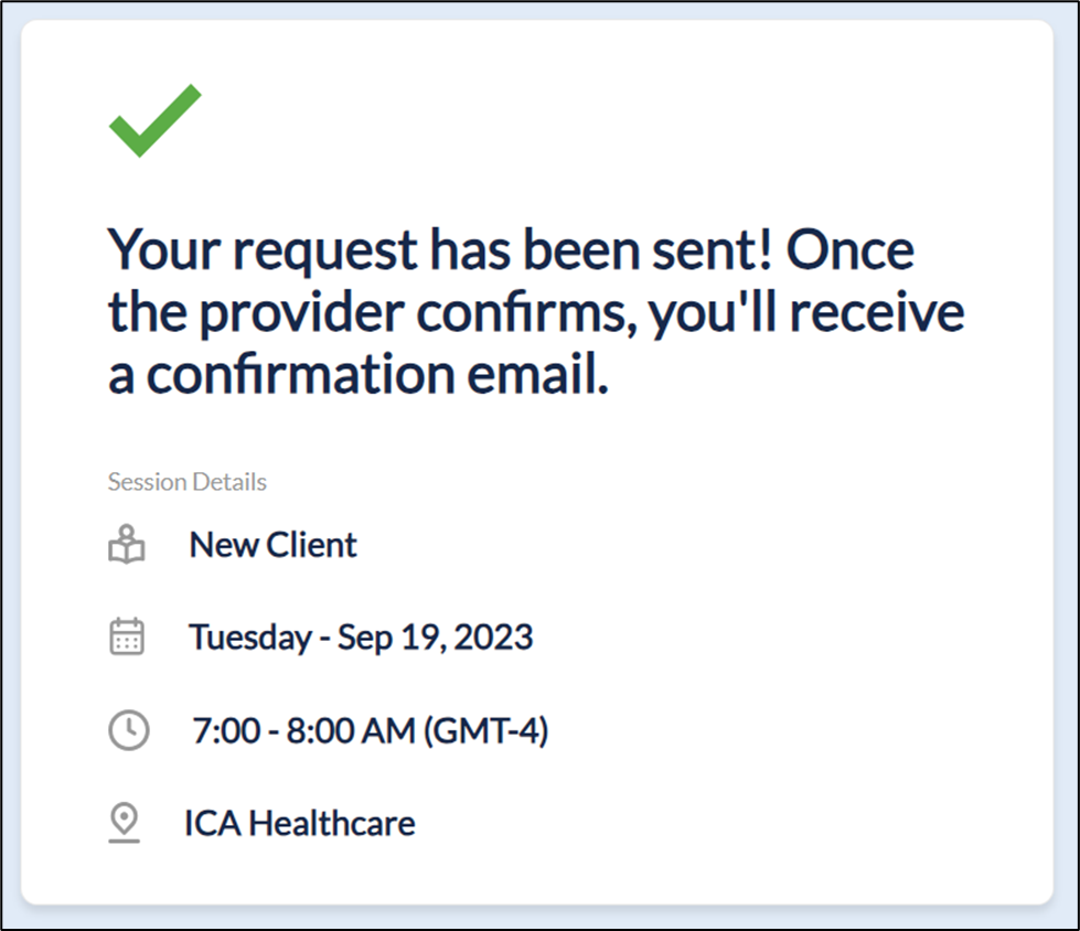 11. Once the Pre-Screening Form is filled out, the clients will see the following screens to notify that their request has been successfully submitted to the practice.
