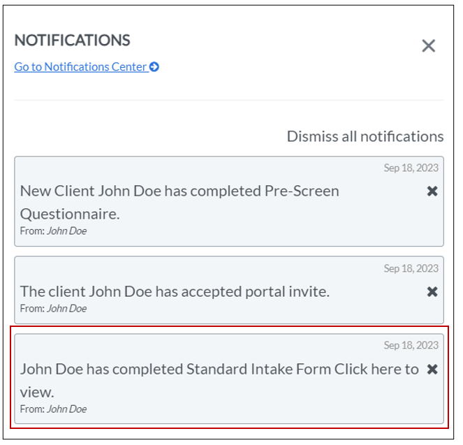 26. In ICANotes plus, you will be notified when the client completes the standard intake form details.