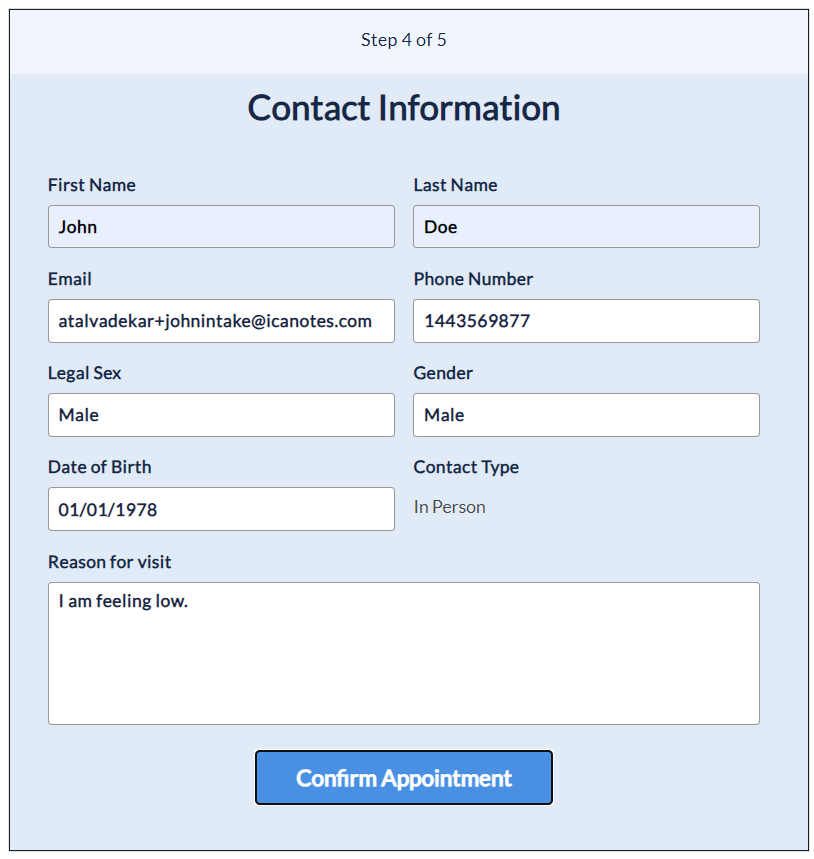 9. The client will then fill out the demographic details as shown in the screen below and enter the reason for the visit. Once done, they will click the Confirm Appointment button.