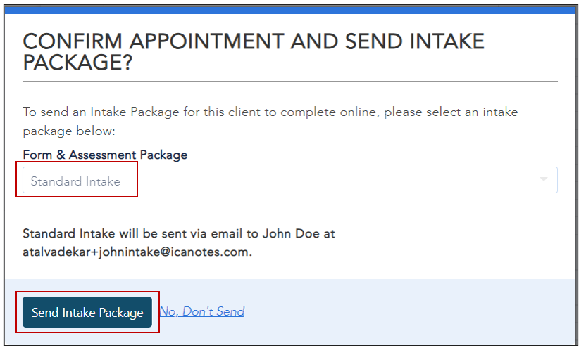 16. When you click the Confirm button, the system will allow you to send the Standard Intake form to the clients to fill out the details.