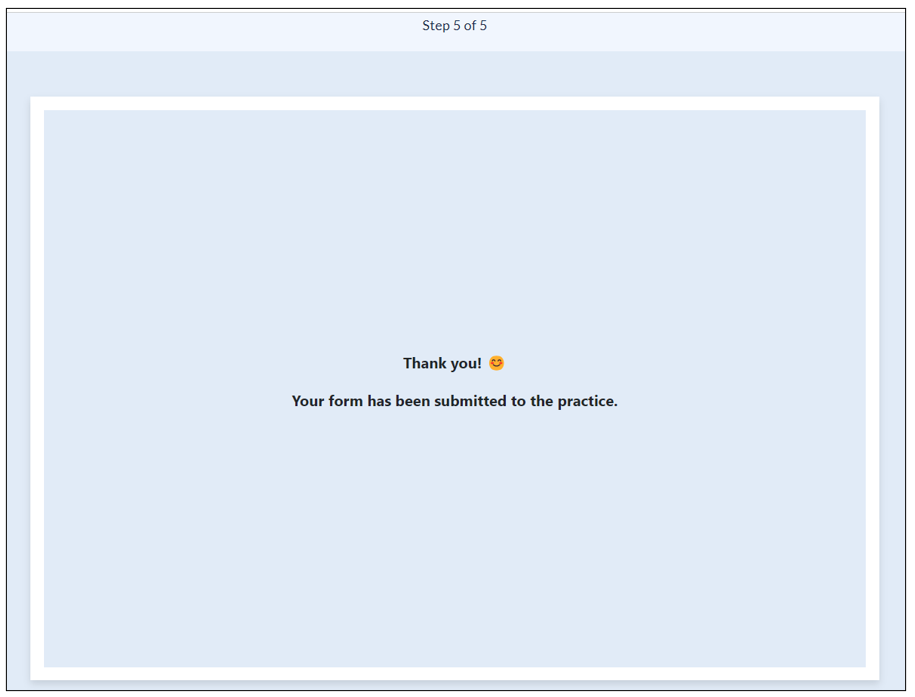 25. Once the entire set of questions is complete, the client will see the following screen to notify that the form has been submitted to the practice successfully.
