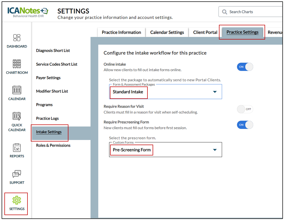 4. On the Settings screen, select the Practice Settings tab and then select the Intake Setting option from the left menu.