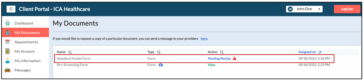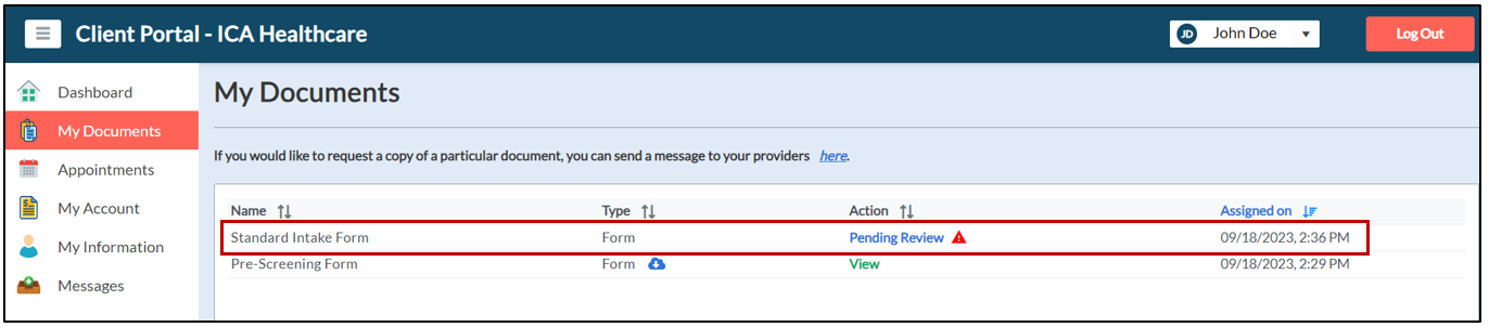 22. On the My Documents page, they can click the Standard Intake Form link as shown below.