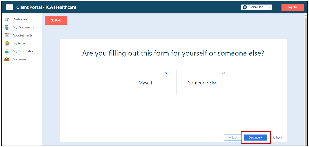 24. The client can answer all the questions that you have configured in the Standard Intake Form and click Continue.