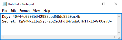 Note: Once you leave this screen you will no longer be able to copy the Key or Secret. Be sure that you have copied the credentials before you navigate from this screen.