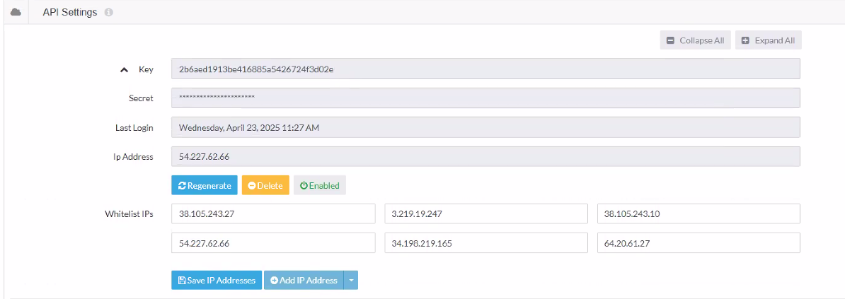 button to delete the API settings.
