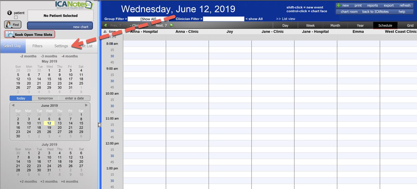 1. To start this process, open the Appointment Book drawer in the Chart Room and look for the Settings tab on the left.