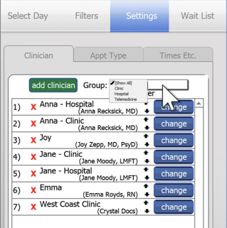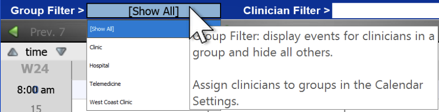 10. In addition to the filter in the clinician list, the main benefit to assigning clinicians to groups is being able to filter the calendar display by these groups. This is done in the main calendar grid using the Group Filter. Selecting from the list allows you to view only appointments for clinicians in that group on the grid.