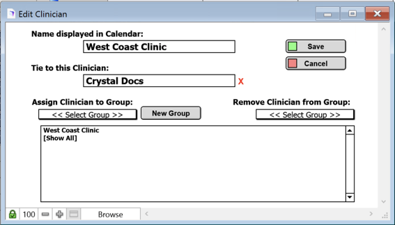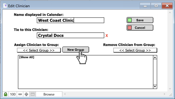 5. This will open a window where you can enter or edit details about that clinician's calendar entry. If you want to add a group to the calendar, click on "New Group" button.