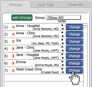 4. To add a calendar group, you can either choose to "Add Clinician," or, if you have an existing clinician you want to add to a group, click the blue "Change" button by their name.