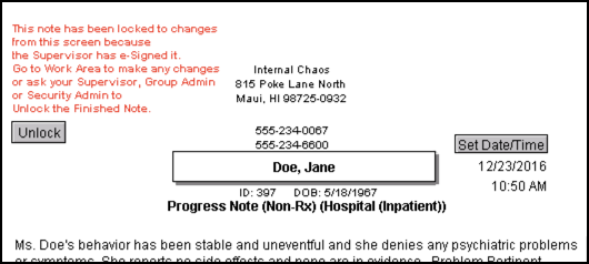 Once the note has been locked, it can be unlocked by the supervisor, group administrator, or security administrator by clicking the