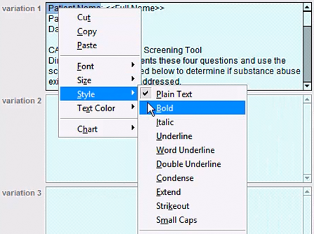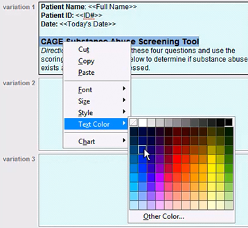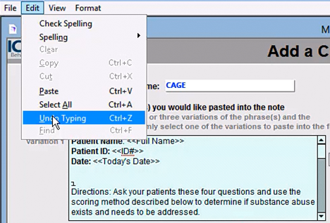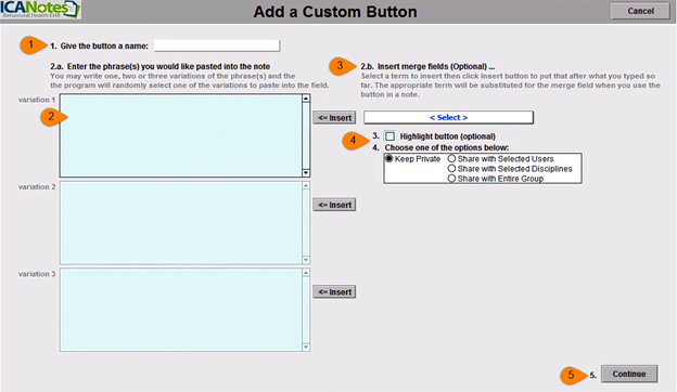 (2) With custom buttons you have the option of creating additional variations of your text. When multiple variations are entered ICANotes will randomize which variation is placed into your note when you click your custom button. You do not need to enter in additional variations, and should include the entirety of your form or assessment in the first variation.