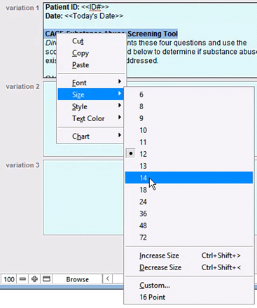 Text can be formatted to change the font type, size, style, and text color to more fully customize your custom form or assessment. To find these options, select the text you wish to modify with your mouse, then right-click to open up the list of options.