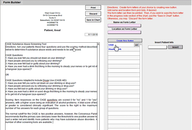 Keep saving and checking your custom button until you are satisfied. When finished, click your custom button to enter it into white text box. You’ll see any formatting applied to your text, as well as the patient-specific information wherever you included merge fields as placeholders. You may continue making modifications to the note itself, then Print or Save in Chart (or Delete) when finished.