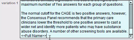 The placeholder will insert itself at the bottom of your custom text. You’ll need to use copy and paste functionality (using keyboard shortcuts, the right-click menu from your mouse, or the internal clipboard for customers on TSPlus) to move the placeholder from the bottom of the variation, to the place in your text where you want the merge field to populate.
