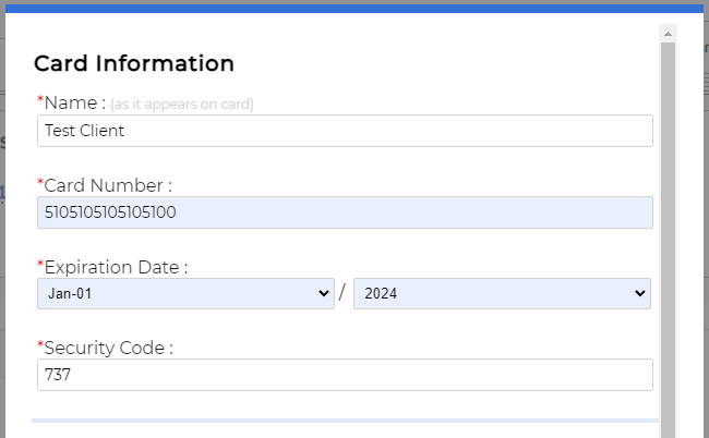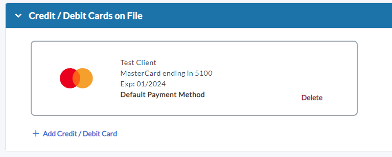 Note: If the client has saved their card on file via their client portal, the card will appear here as well. Learn more about how clients use their portal to make payments and save their card information here.