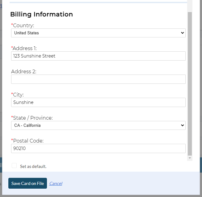Note: Check the "Set as default" checkbox to set this as the client's default payment method.
