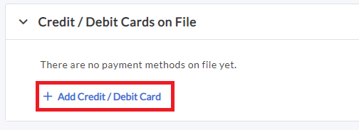 Navigate to client's chart and click the Account button from the top bar and locate the Credit/Debit Cards on File section. Expand this section to review/add/edit cards on file for this client.