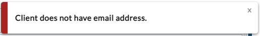 The client must have an email address on file before a credit/debit card can be stored. If you try to add a card on file, you will see the following error message: