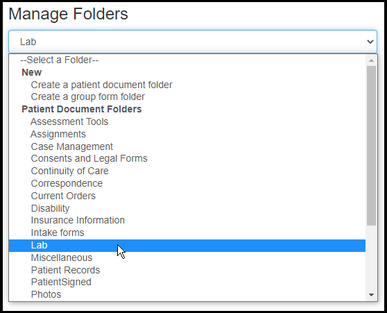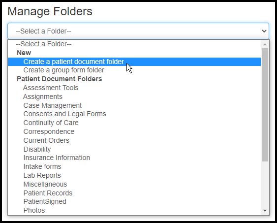 1. In the dropdown menu, select "Create a patient document folder" (or Create a group form folder).