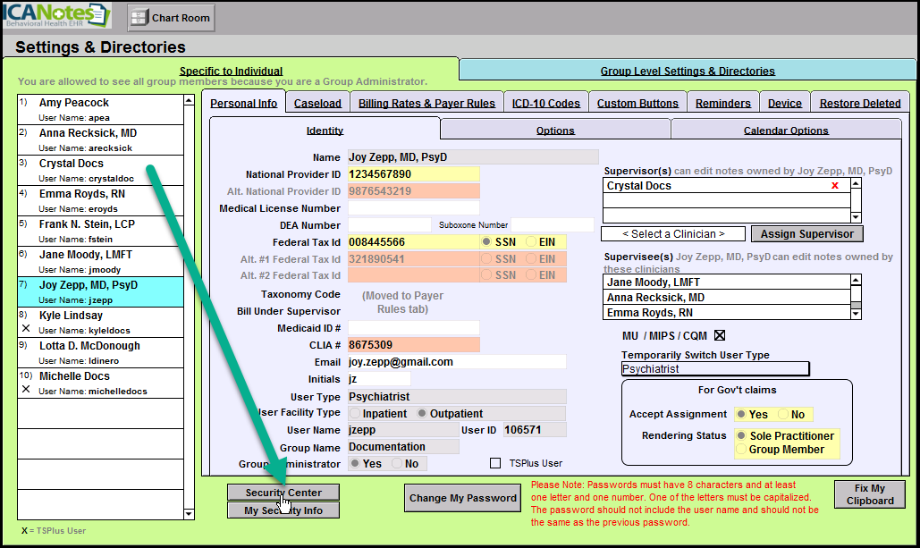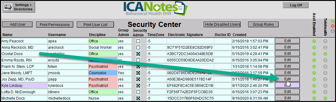 4. In the Security Center, click the button in the row by the user you would like to set up to manage folders.