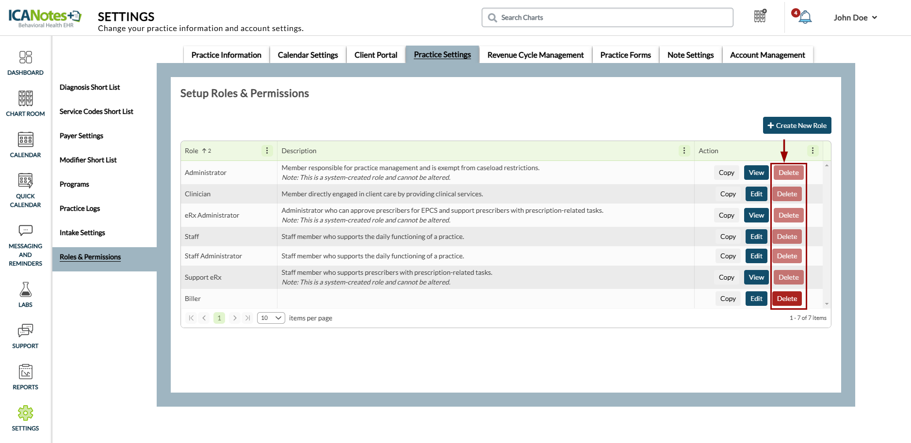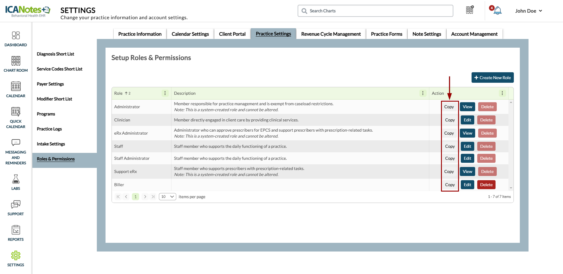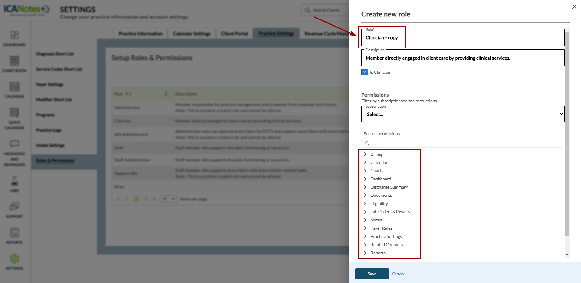 This guide outlines the steps for managing roles and permissions in ICANotes+. Roles determine the actions users can perform within the system, based on their assigned permissions. You can also duplicate existing roles and customize their permissions to create new ones. Note that roles assigned to users cannot be deleted.