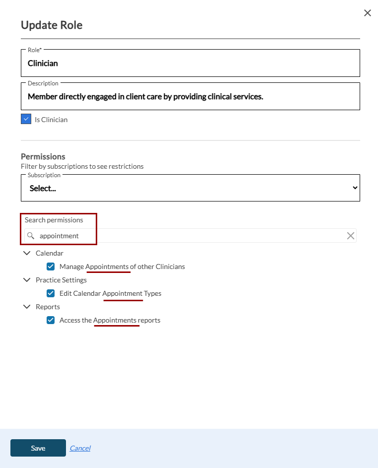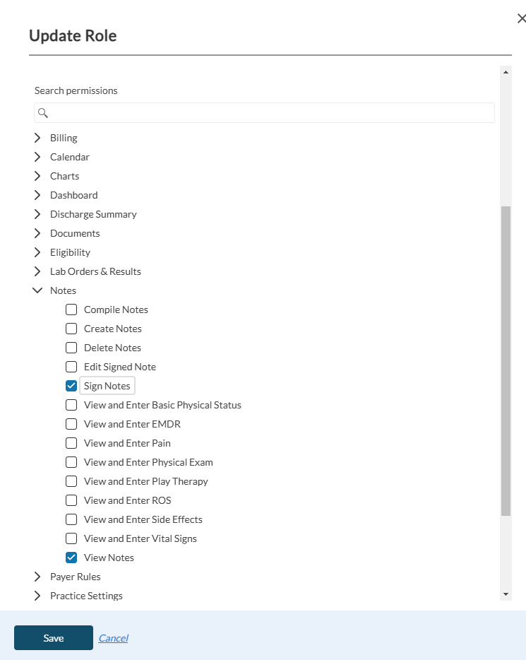 Permissions are influenced by the user's subscription. For example, if you assign the "Sign Notes" permission to a user with a "Staff" subscription, they will not be able to sign notes, as their subscription does not support this action.