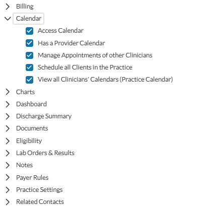 Expand each feature to view and assign its actions. For example, permissions for the Calendar feature are displayed in an organized, alphabetical manner within their section.