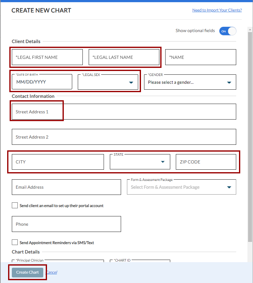 To record client details, navigate to the chart room and click the New Chart button. Record client details as depicted in the screen below and click Create Chart.