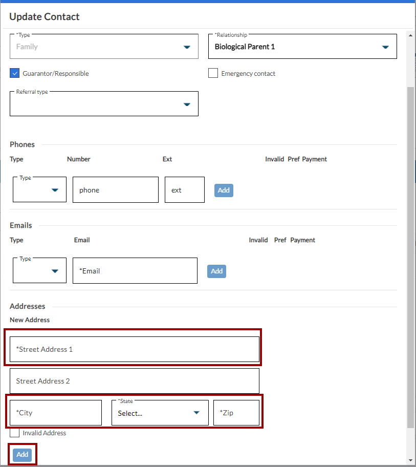 On the Update Contact screen, ensure that the primary insured member's street address 1, city, state, and zip code are recorded.