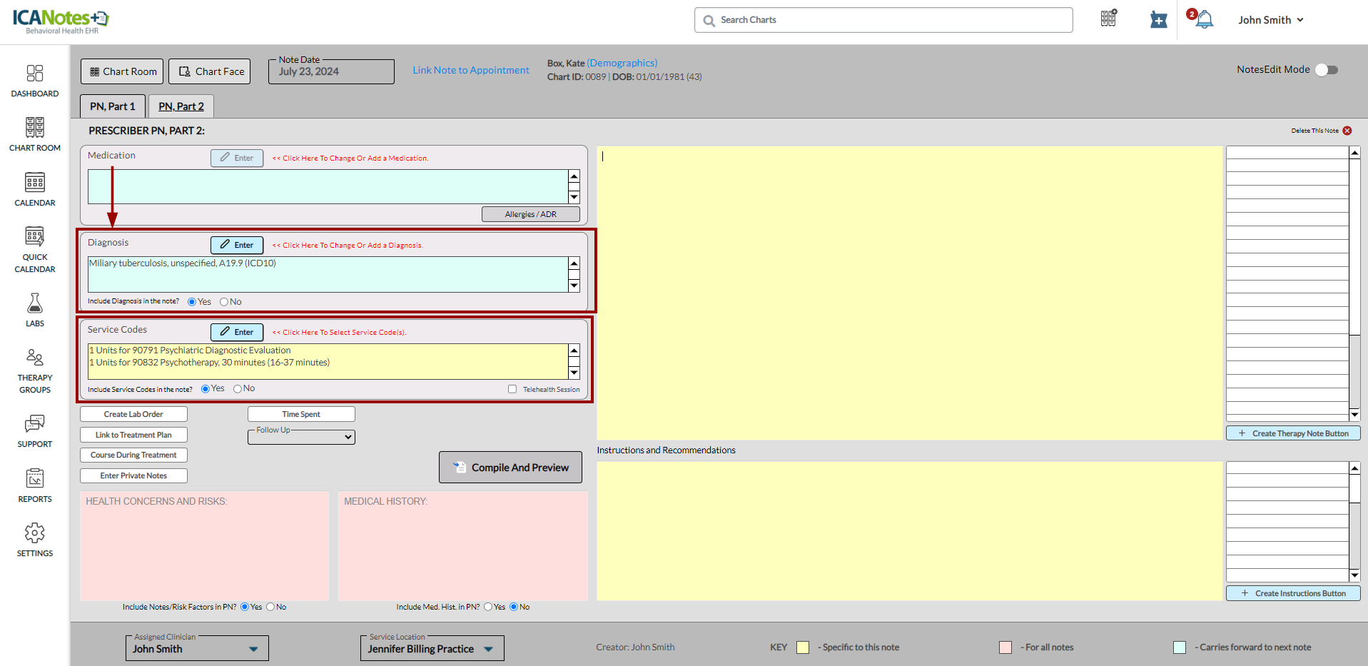 To record service and diagnosis code details, navigate to the client's chart face and create any note allowing you to record these details. In this example, the Progress Note is created.
