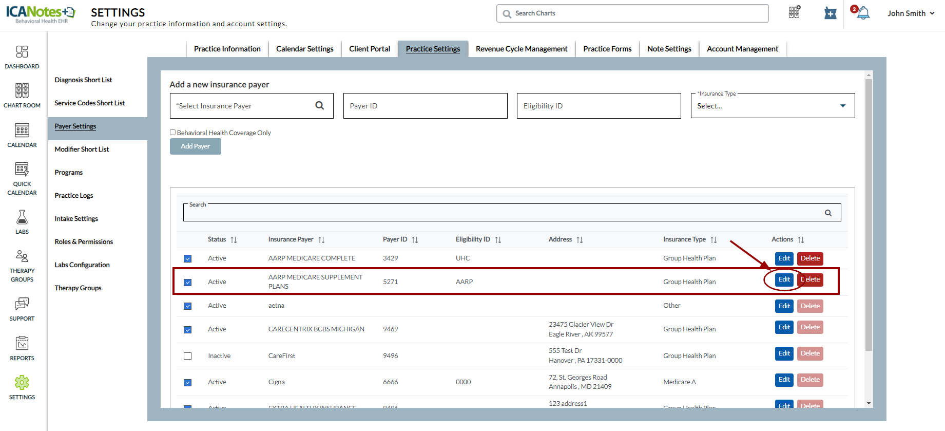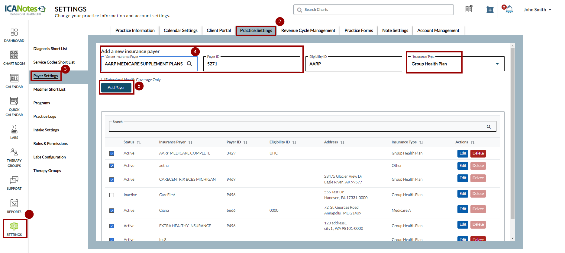 To record the payer information, navigate to Settings > Practice Settings > Payer Settings. Record the details as depicted in the screen below and click Add Payer.