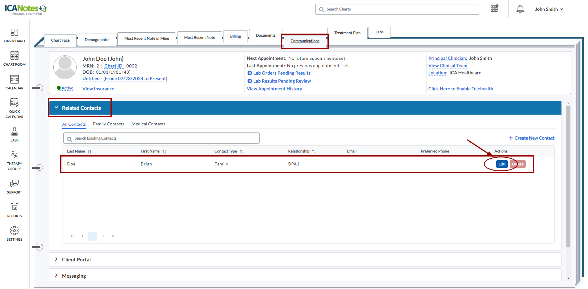 Navigate to the client's Chart Face > Communications tab > Related Contacts panel and click the Edit button as highlighted in the screen below: