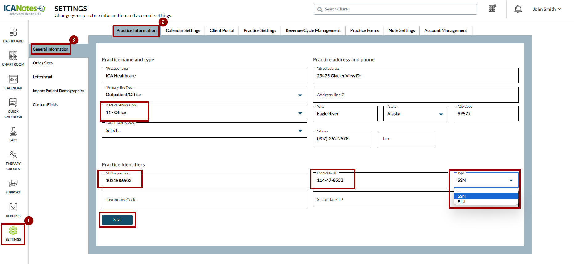 To record the practice information, navigate to Settings > Practice Information > General Information. Record highlighted details and click Save.
