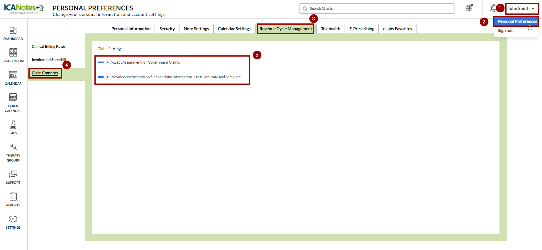 To record the assigned clinician (rendering provider) consents, navigate to logged in provider name > Personal Preferences > Revenue Cycle Management > Claim Consents.