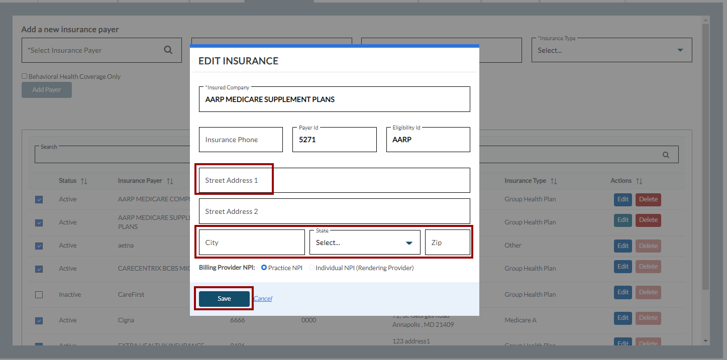 On the Edit Insurance screen, record payer's street address 1, city, state, and zip code. Once recorded, click Save.