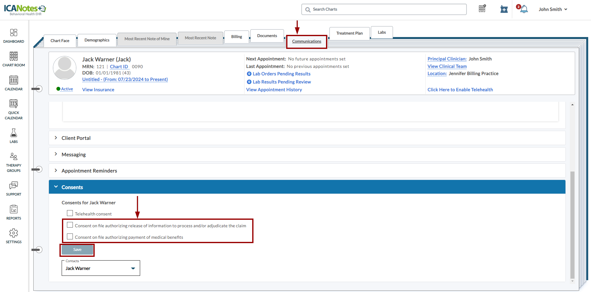 To record the consent details, navigate to the client's chart face and select the Communications tab as shown below: