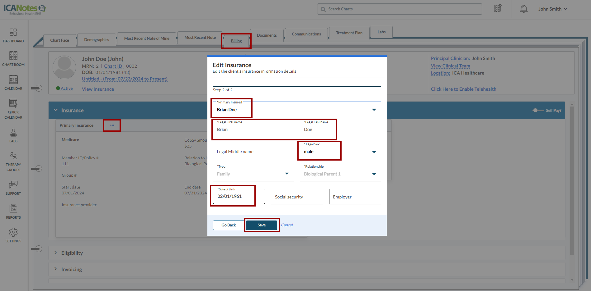 Navigate to the client's Chart Face > Billing tab > add or edit insurance details. On the first page, enter the insurance details and click Next. The following screen will appear. Ensure that the primary insured, legal sex, and date of birth are selected.