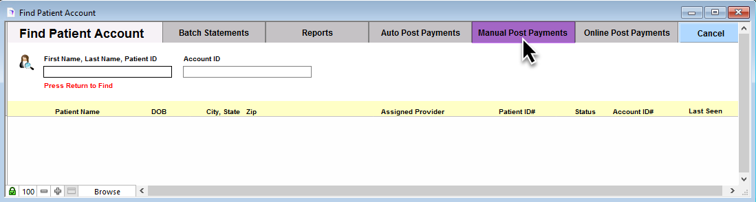 Start by navigating to Patient Accounts from the Chart Room, then Manual Post Payments