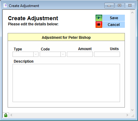 For adjustments, click the blue + icon to open the Edit Adjustment window