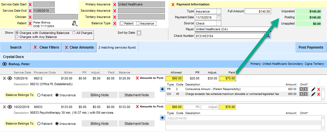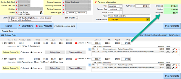 Before posting, check the Unapplied amount from the Payment Information section at the top right of the screen. If an unapplied balance remains, you’ll receive a prompt. The remaining balance may be recalled later in Manual Post Payments by searching for the check number, as highlighted in yellow below:
