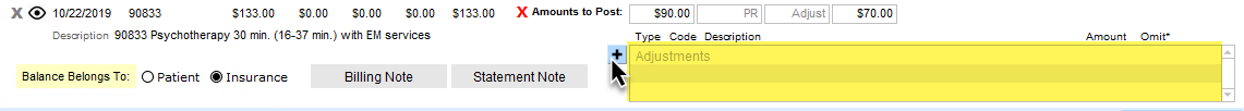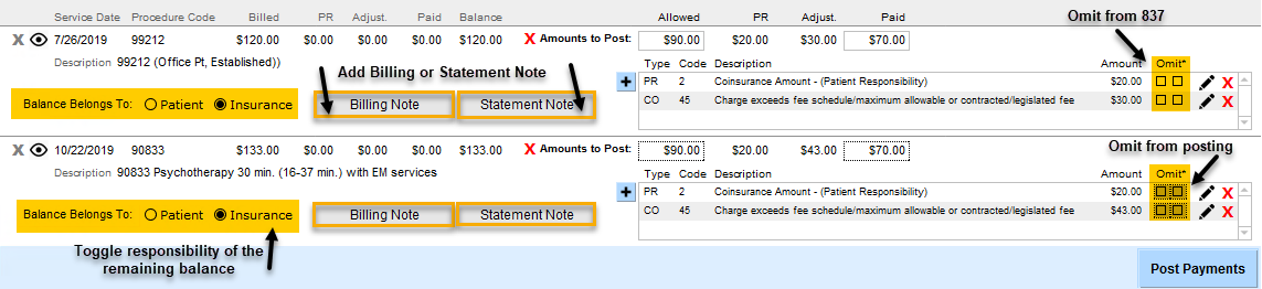 Click the blue + icon for each adjustment, adding as many as are necessary from the EOB. Additionally, you have options for changing the responsibility of any remaining balance and create a Billing or Statement Note. Within the Adjustment window, the Omit checkboxes can be checked to situationally omit the adjustment from the subsequent 837 (for electronic billing), or omit from posting. If choosing to Omit from Posting, the adjustment will display with the payment information in Patient Accounts, but the amount of the adjustment will not be calculated into the balance.