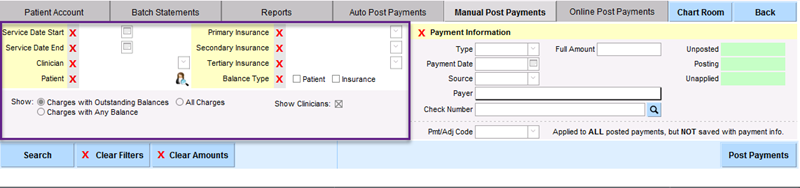 Use the patient search filters at the top left to search for all applicable patients related to the insurance payment you are posting/in the EOB. Filters for Service Date, Clinician, Insurance, and Balance Type, as well as the ‘Show’ options underneath (Charges with Outstanding Balances, Charges with Any Balance, All Charges and Show Clinicians) can be used together to find all patients on the EOB.