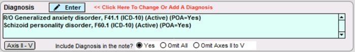 If a diagnosis code cannot be found in the pre-populated diagnosis entries, one can be manually entered in the work areas of a note.